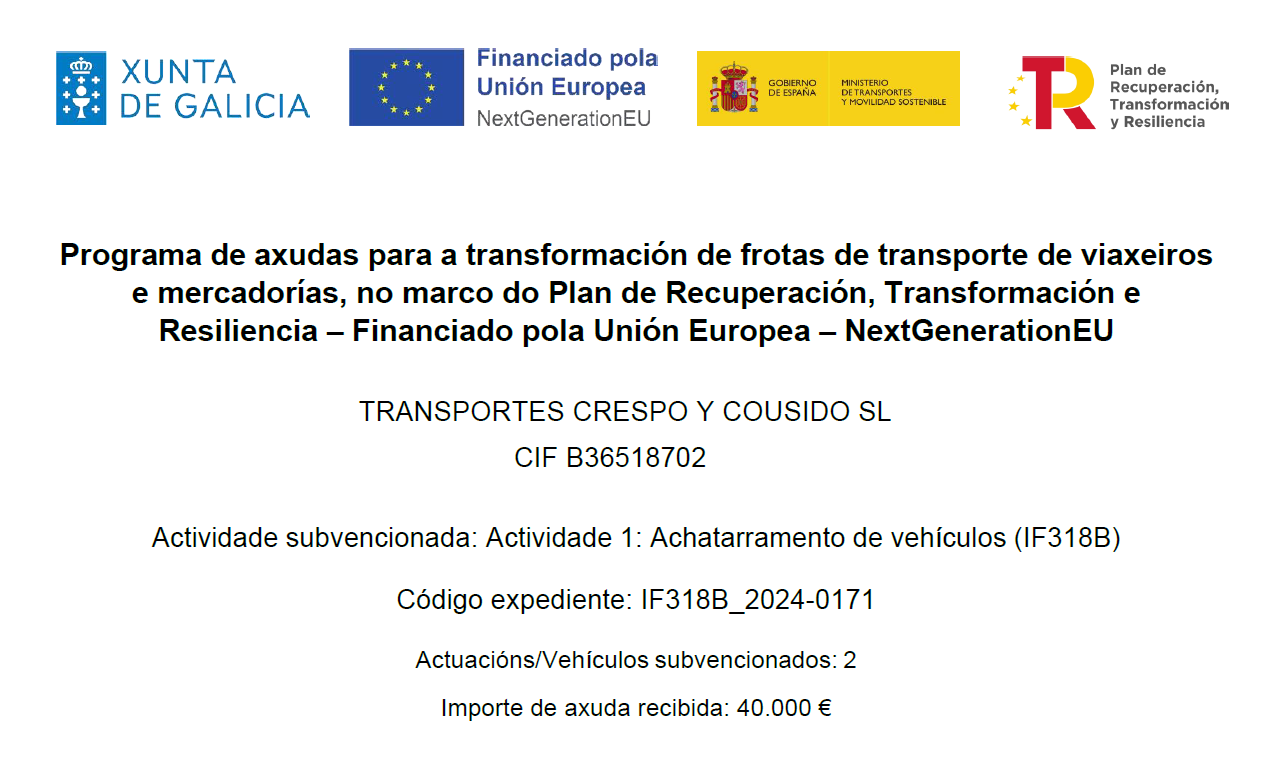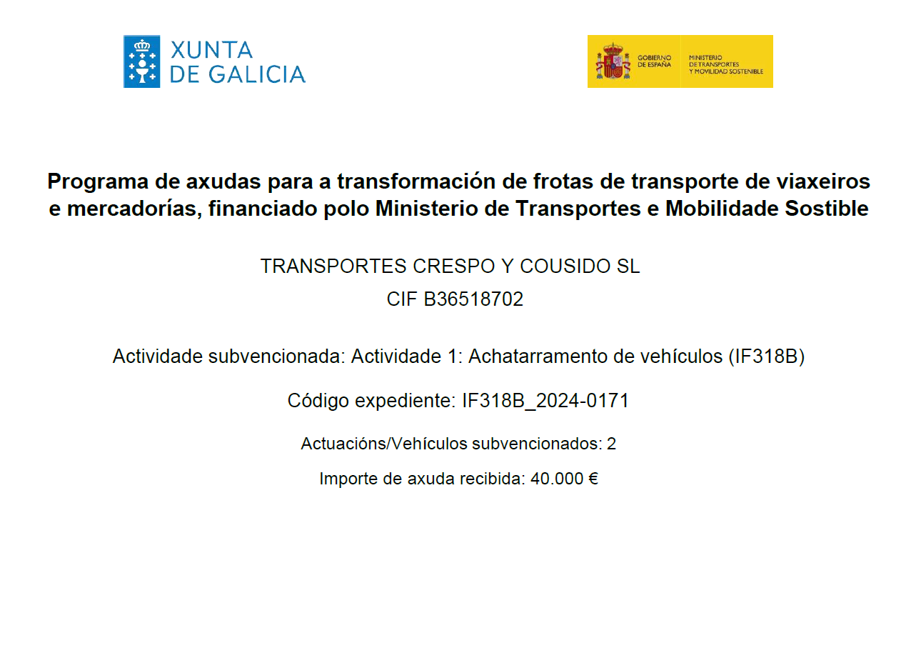 TRANSPORTES CRESPO Y COUSIDO LS. Somos una empresa fundada en el 2006 para la prestación de servicios de transporte de mercancía por carretera y nuestro objetivo es garantizar la satisfacción óptima de nuestros clientes. Constituida para el transporte internacional iniciamos esa aventura con apenas tres cabezas tractoras. Nos avalan casi 2 décadas dando servicios a grandes multinacionales de alimentación, pasteras y marítimas. También contamos con expertos calificados que se aseguran de que obtenga los servicios que necesita. Nuestros servicios son únicos ya que nuestro objetivo es personalizarlos según las necesidades del cliente.